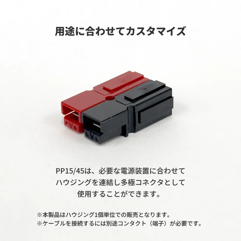ハウジングは1極(+/-をそれぞれ1個ずつ)で、左右にスライドして結合できる構造。2極・多極構成を自由に作れるのが大きな特長です。