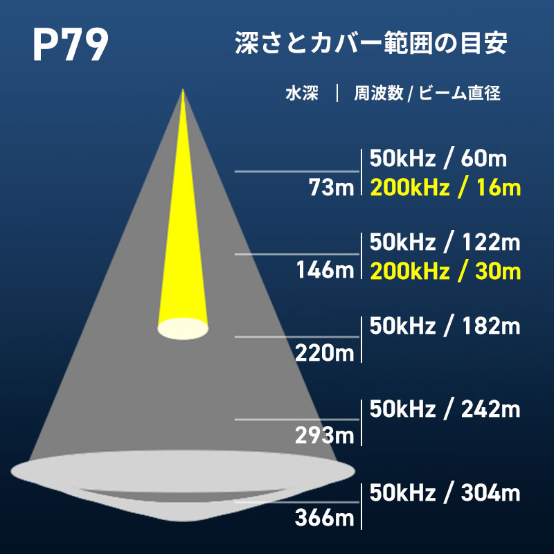 50/200kHzのデュアル周波数で動作し、最大深度は50kHzで294m、200kHzで180mとなります。
